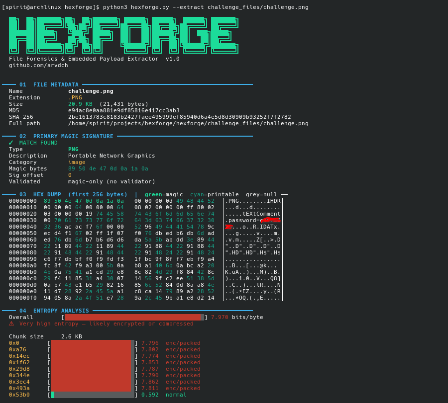 Every CTF player has run binwalk on a challenge file hoping for a quick win, only to get a wall of false positives — or worse, a clean scan on a file that obviously has something hidden in it. I got tired of stitching together file, strings, binwalk, and a hex editor for every forensics challenge. So I built HEXFORGE: a single Python script, zero dependencies, that does all of it.