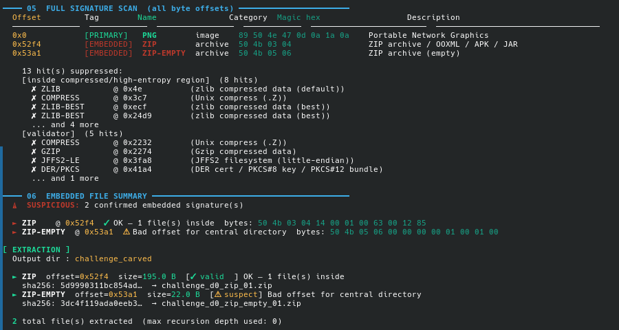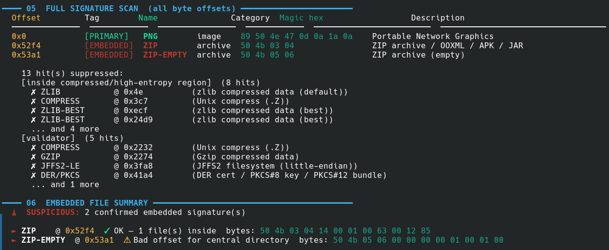 Any hit inside a mapped region is suppressed if the magic is shorter than 6 bytes. On the CTF challenge PNG below, this drops 13 false positives and leaves exactly 2 real embedded signatures.