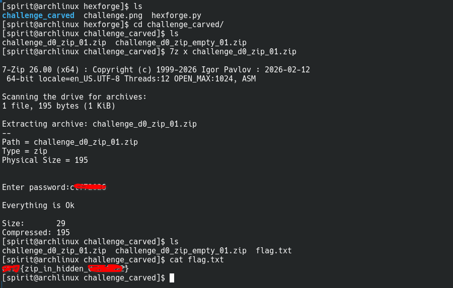 Running with --extract carves the ZIP precisely (using EOCD walking), opens it, and extracts flag.txt.