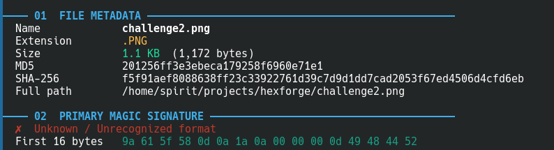 A common CTF trick is XOR-ing the magic bytes of a file to fool file and basic scanners. challenge2.png has its first byte changed from 0x89 to 0x9a — the file command reports it as “OpenPGP Public Key”. HEXFORGE catches this: