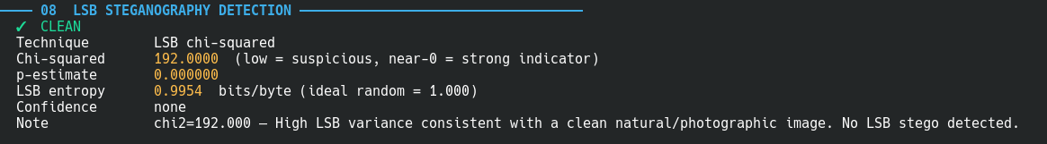 Beyond the chi-squared score, the detector extracts the first 64 bytes of the LSB bitstream (MSB-first) and checks if they look like printable text. On a CTF image with a flag embedded in the LSBs, this preview shows flag{lsb_hidden_in_plain_sight} directly in the terminal output.